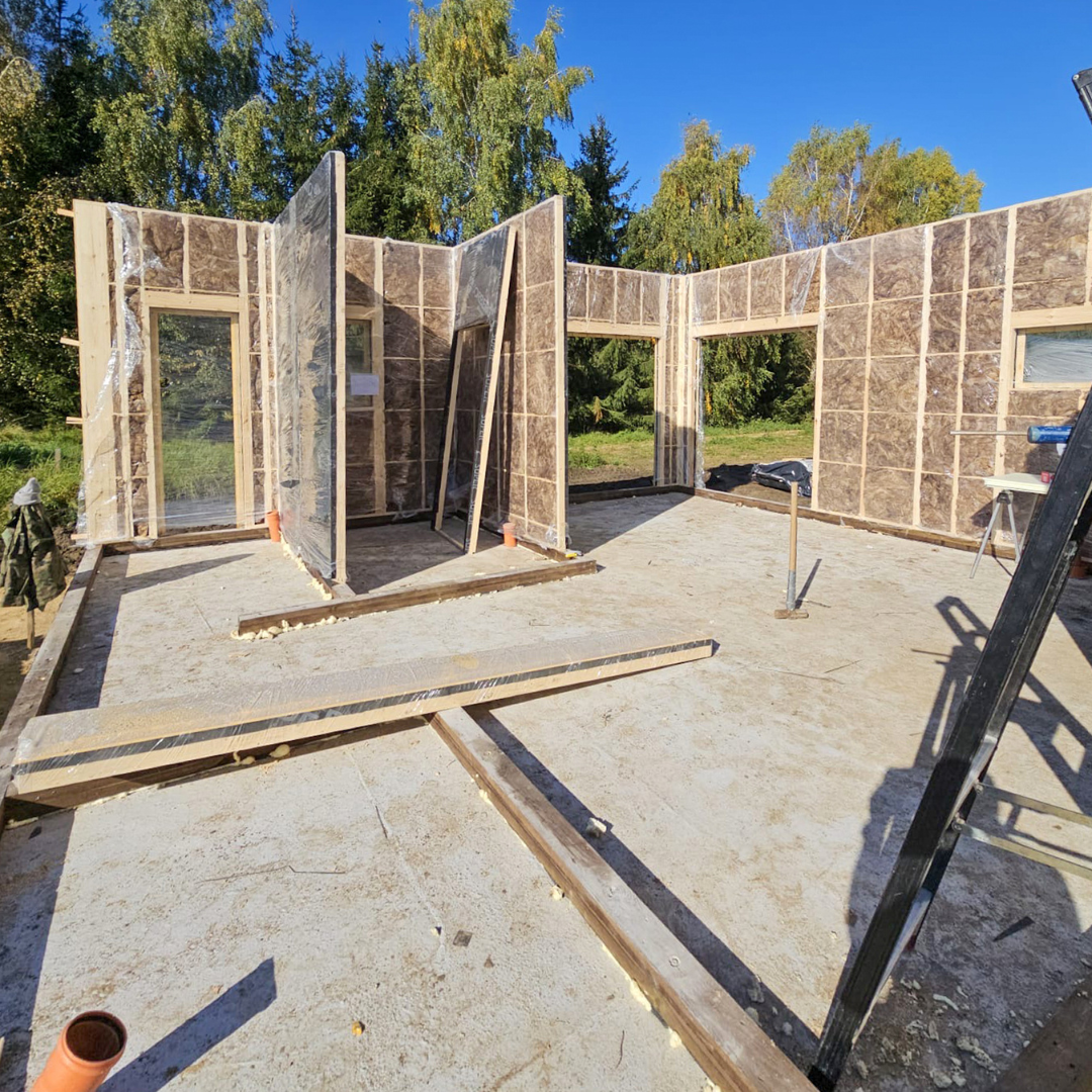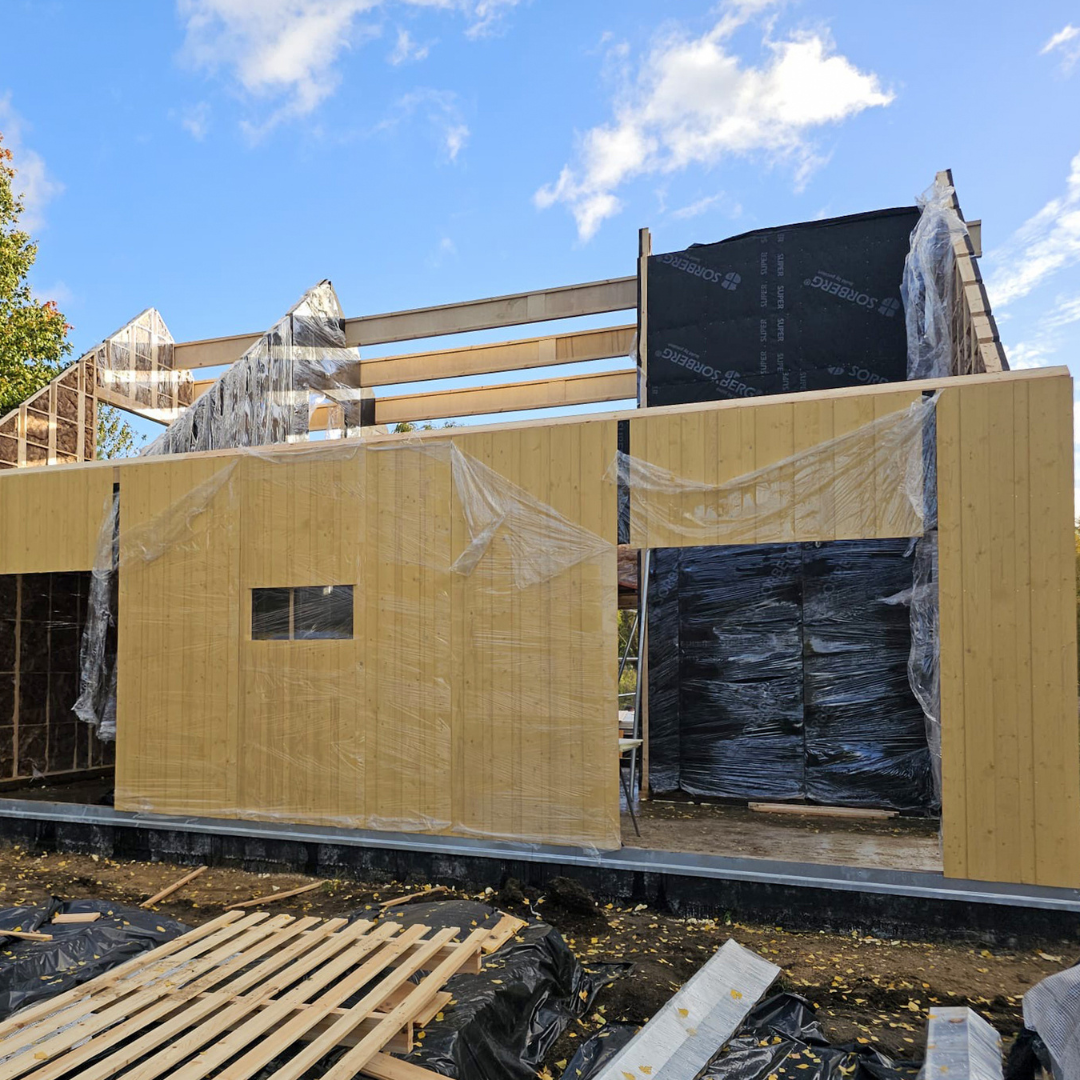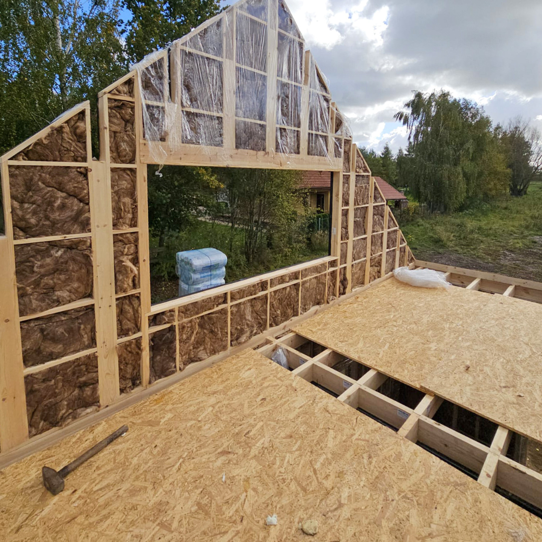 Zamiast produkować duże bloki wymagające użycia żurawia (jak to jest w zwyczaju w budownictwie modułowym), produkujemy modułową część – precyzyjne, lekkie i gotowe do montażu elementy domu szkieletowego.