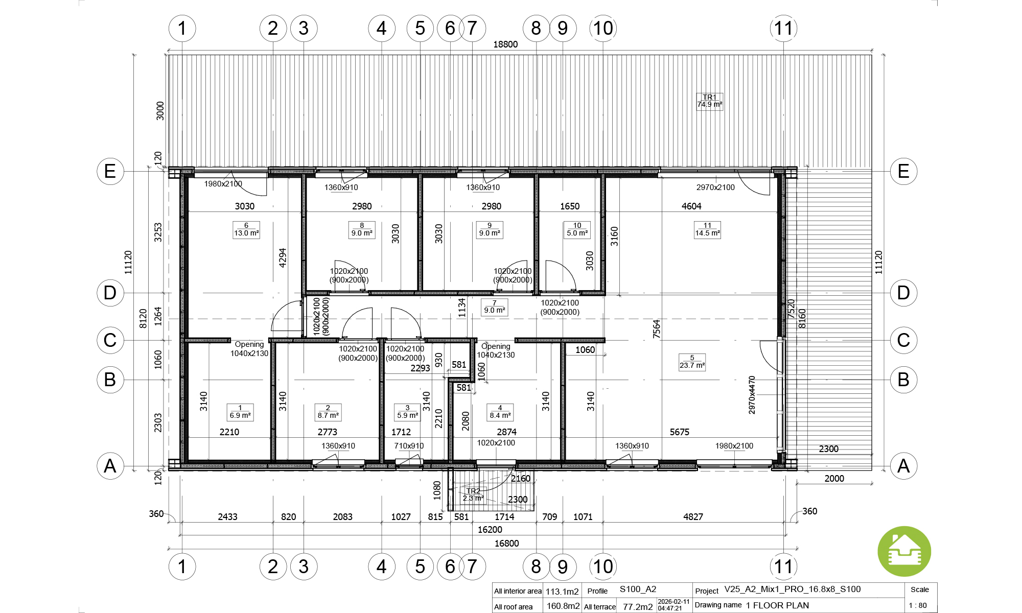 W realizacji stosujemy technologię nowoczesne domy z drewna z wysokiej jakości stolarką okienną i drzwiową, systemem ociepleń „PRO” oraz starannie wykończoną elewacją. W opcjach dodatkowych oferujemy możliwość wyboru koloru panele podłogowe winylowe (szeroka gama kolorów), izolacji podłogi, wykończenia ścian i sufitów w drewnianej boazerii lub płytach FARMACEL, a także koloru zewnętrznych desek elewacyjnych i stolarki okiennej PVC.