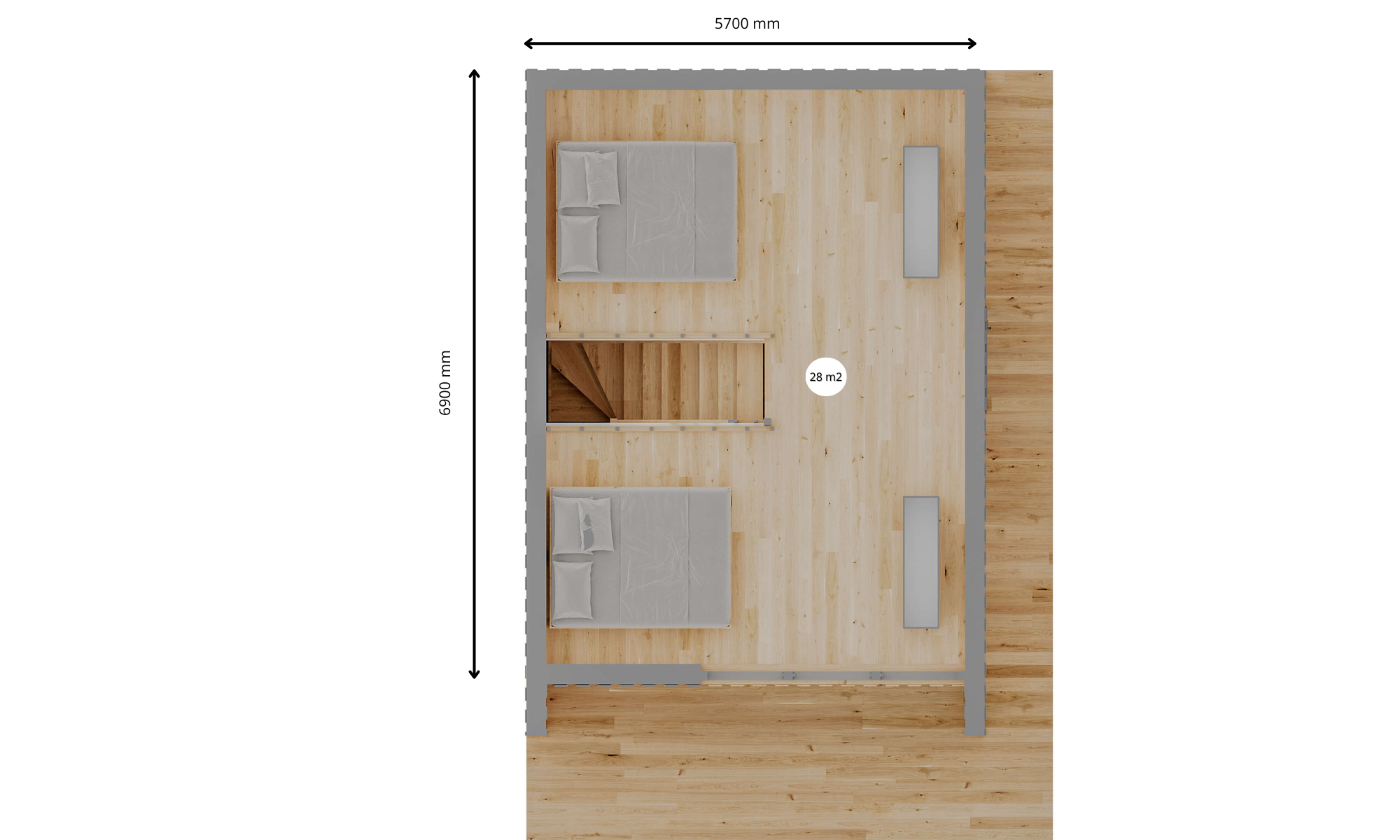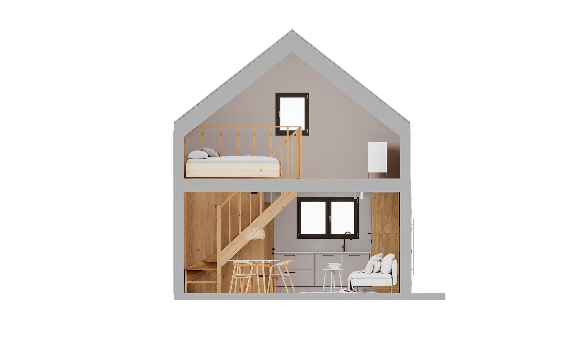 Przemyślany układ – Na parterze znajduje się salon z kuchnią, jadalnia i łazienka, a na antresoli – dwie wygodne strefy sypialniane o łącznej powierzchni 28 m². To idealna przestrzeń do odpoczynku.