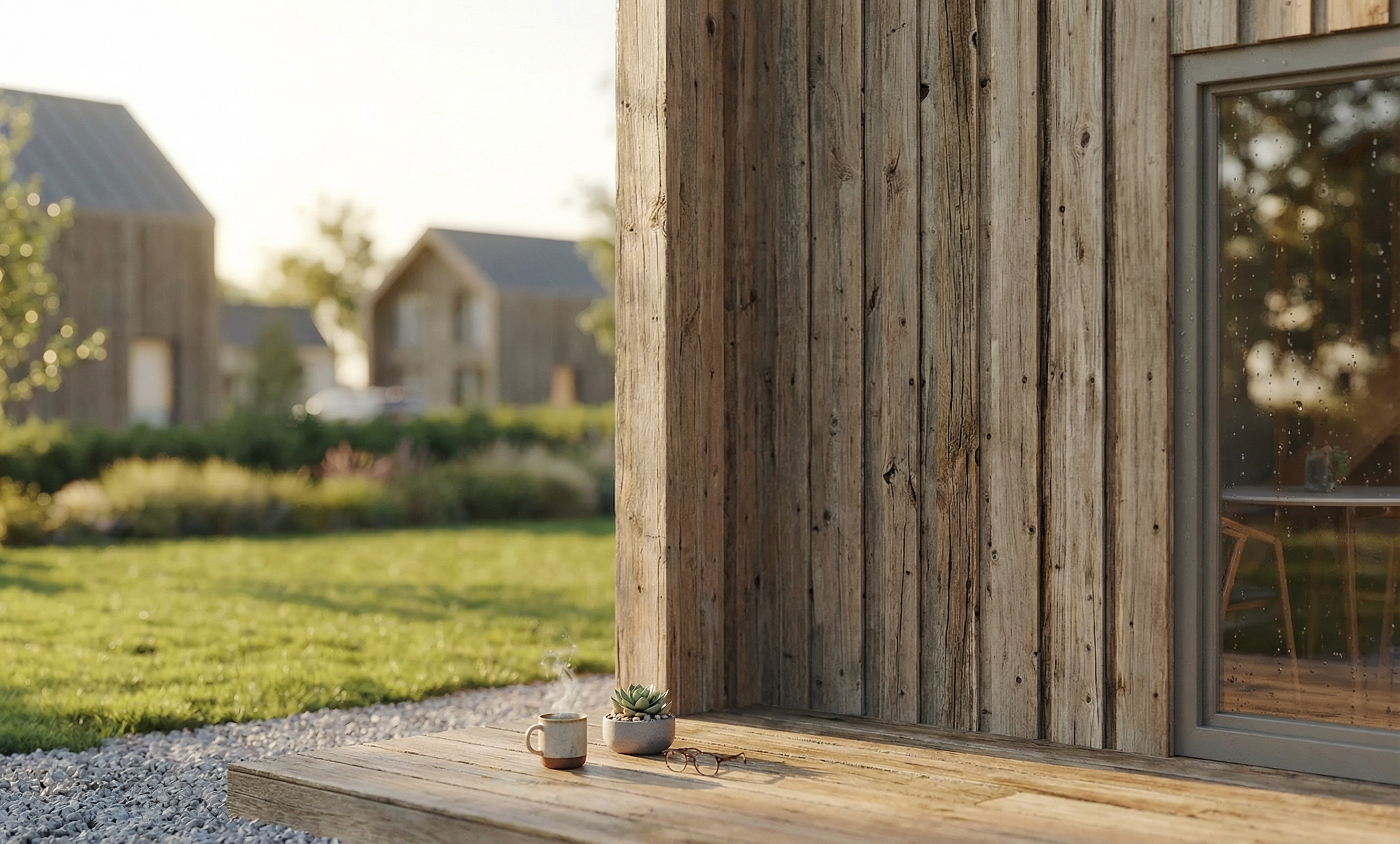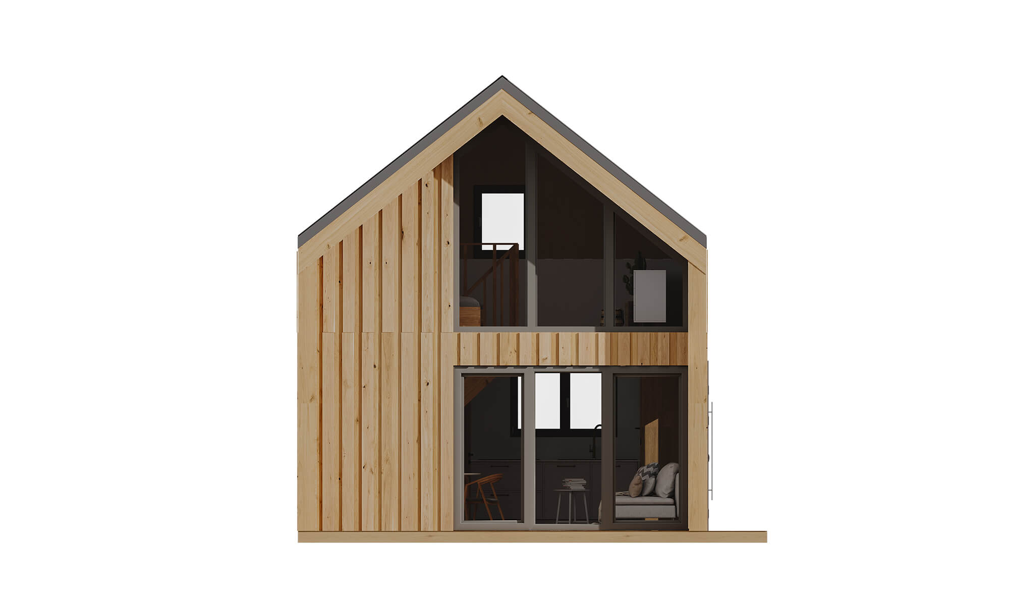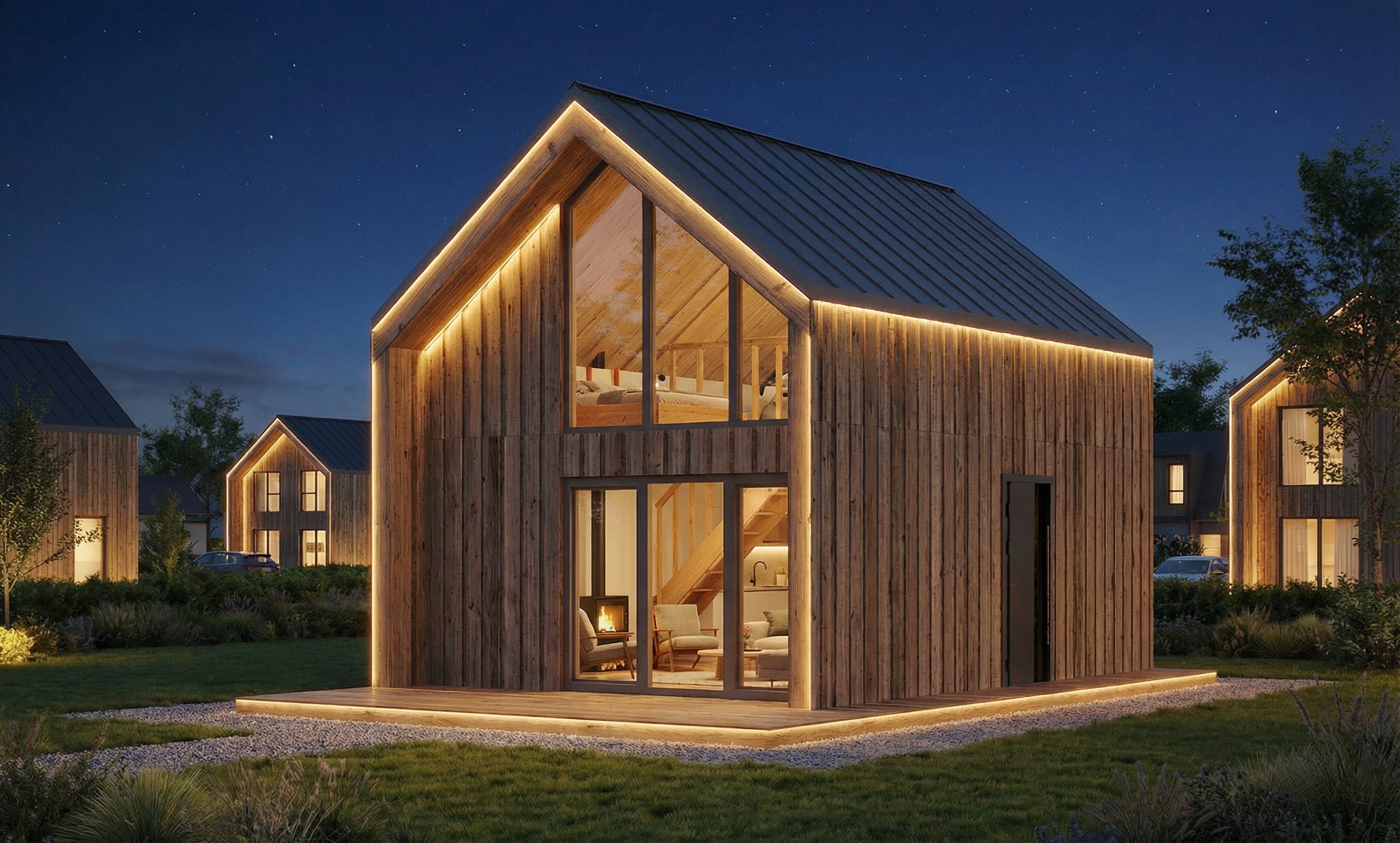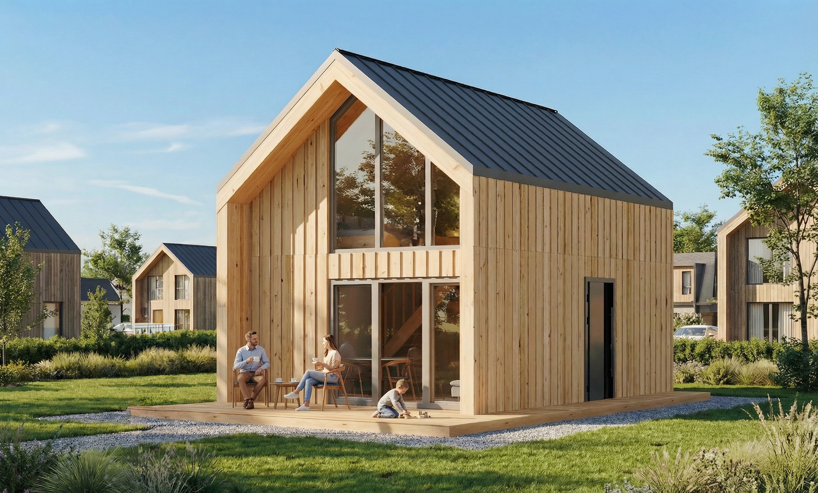 Nowoczesna architektura – Naturalne drewno, duże przeszklenia i jasne wnętrza tworzą przytulny, współczesny charakter domu.