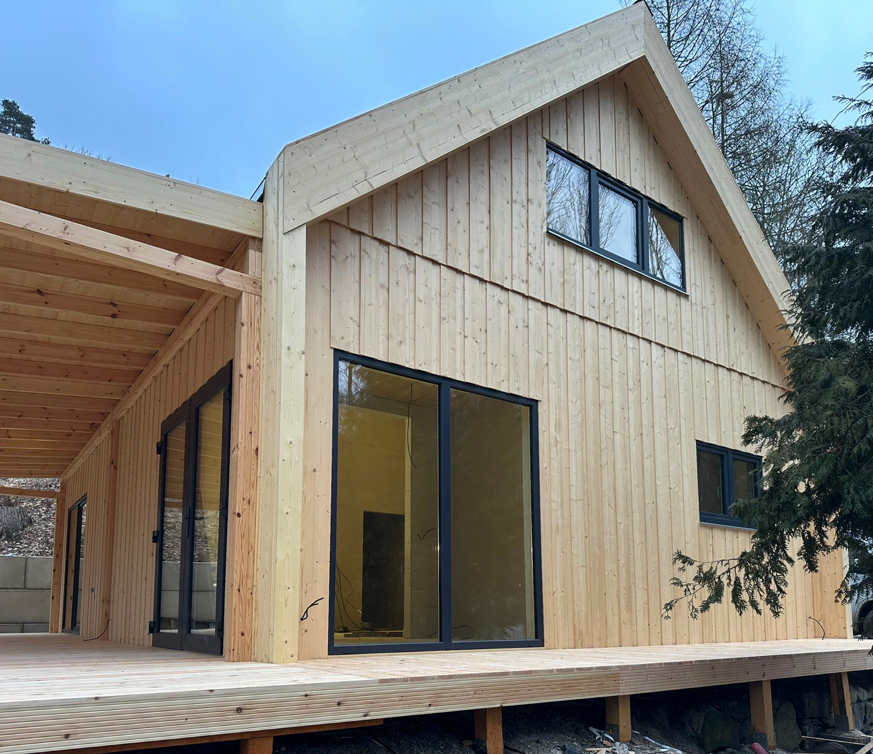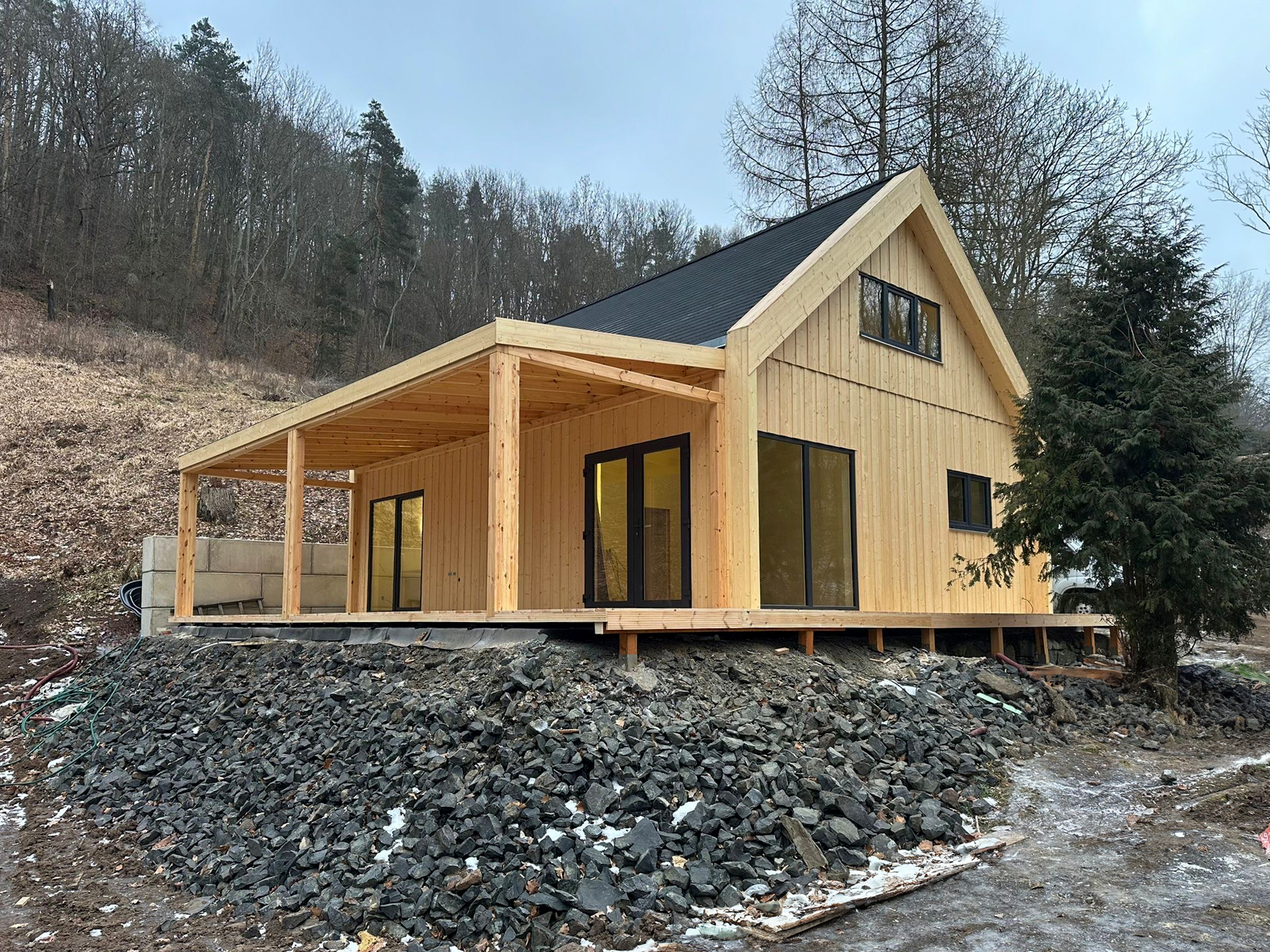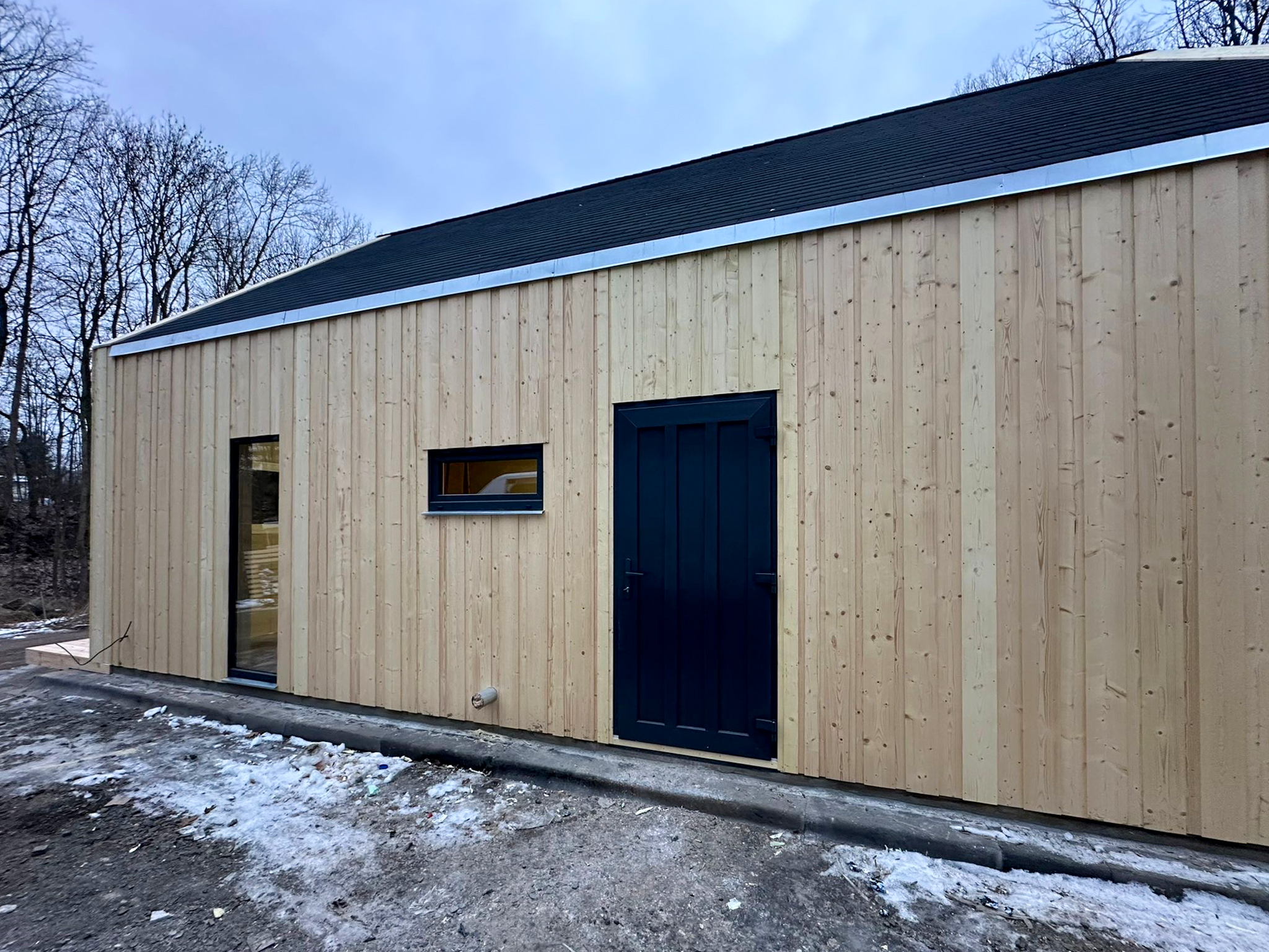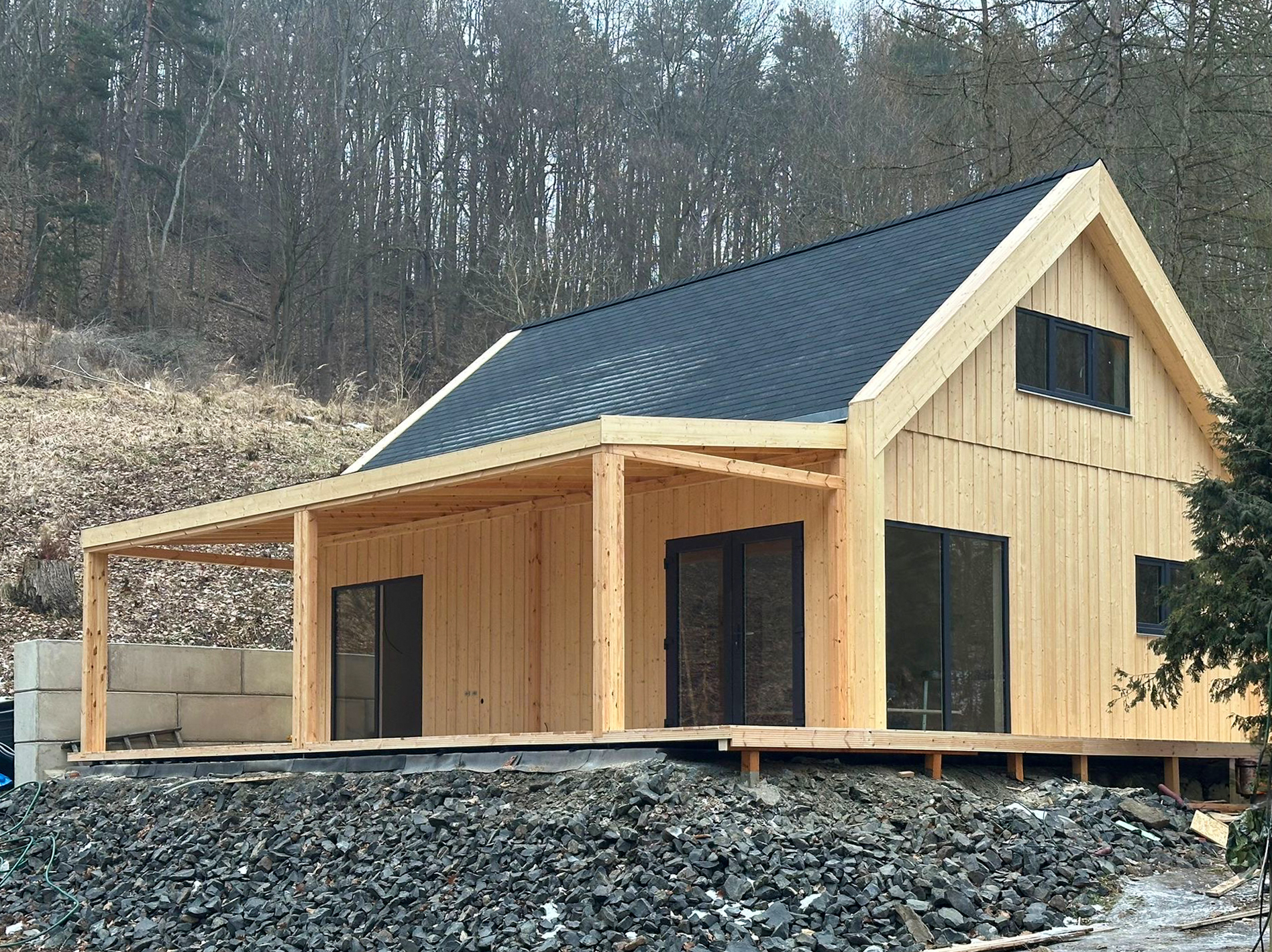 Konstrukcja domu oparta jest na nowoczesnych rozwiązaniach z prefabrykowanych modułów, co umożliwia szybki montaż – nawet w 4–5 tygodni wraz z pełnym wykończeniem wnętrz.
