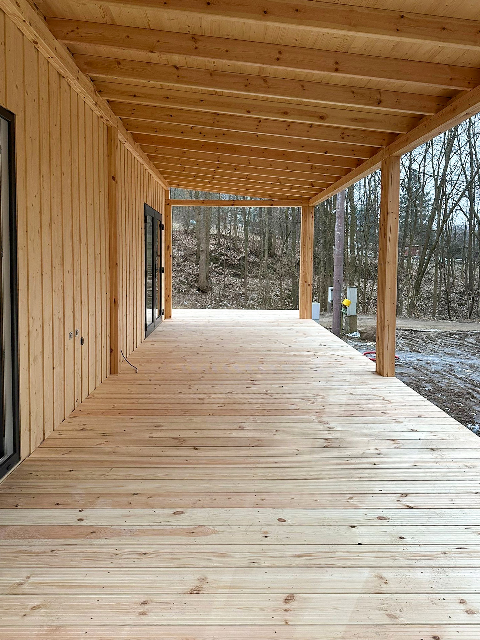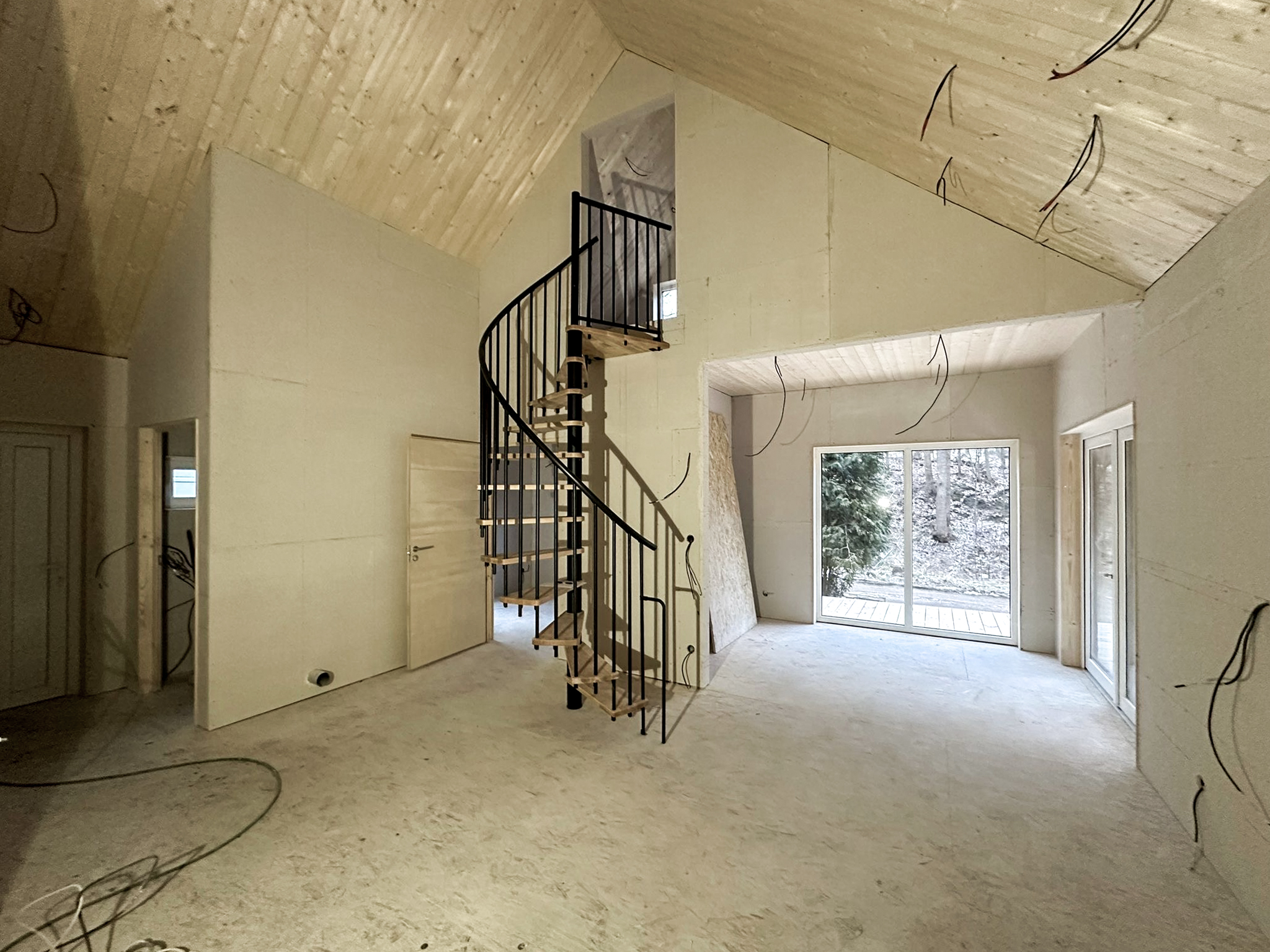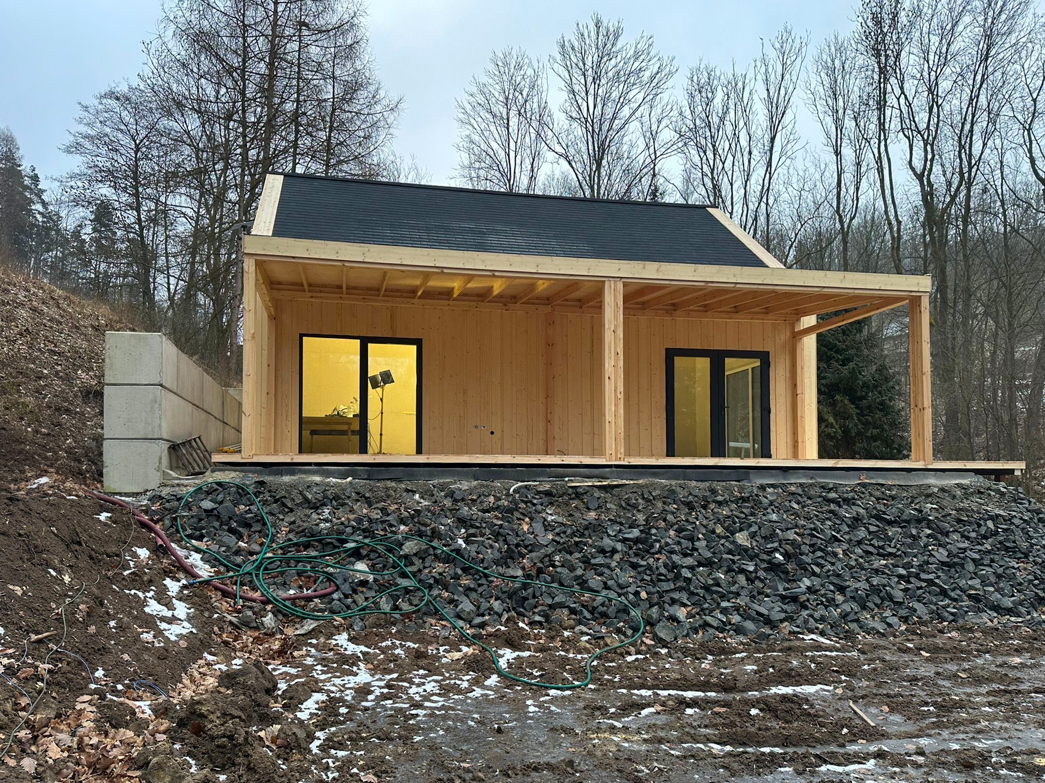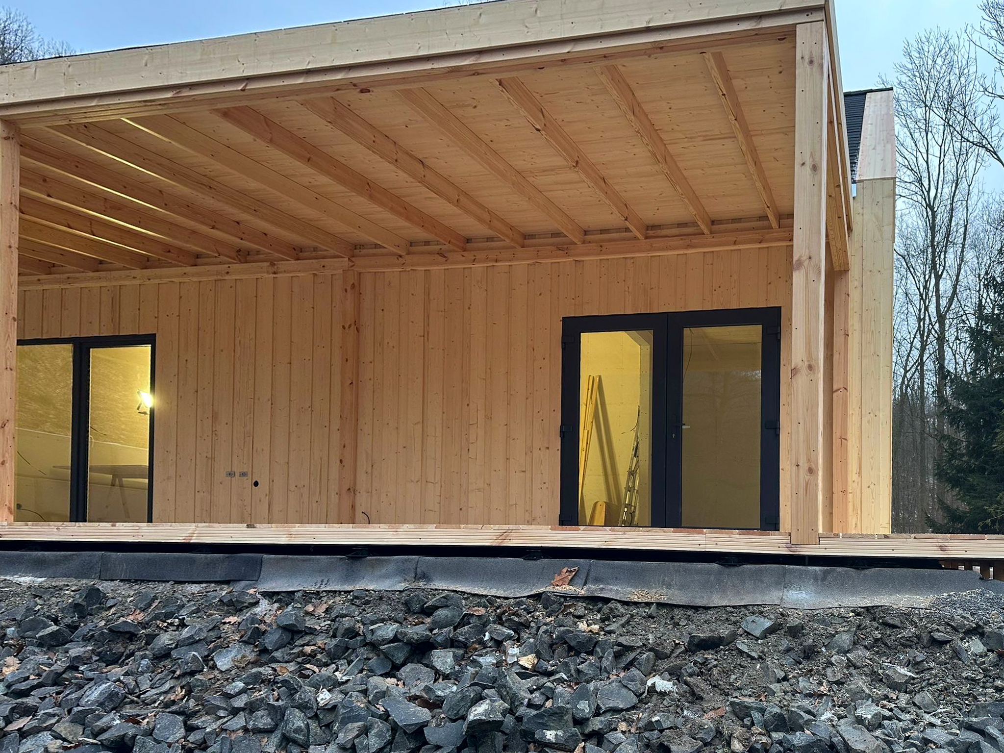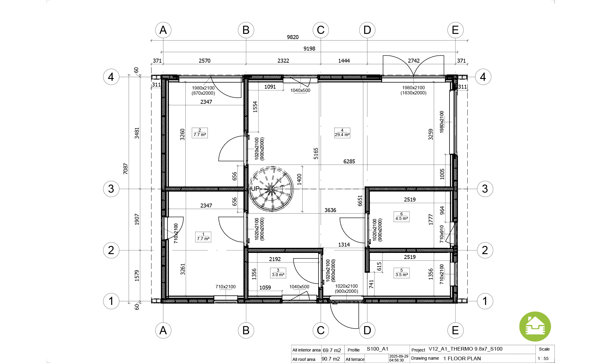 Konstrukcja domu oparta jest na nowoczesnych rozwiązaniach z prefabrykowanych modułów, co umożliwia szybki montaż – nawet w 4–5 tygodni wraz z pełnym wykończeniem wnętrz.