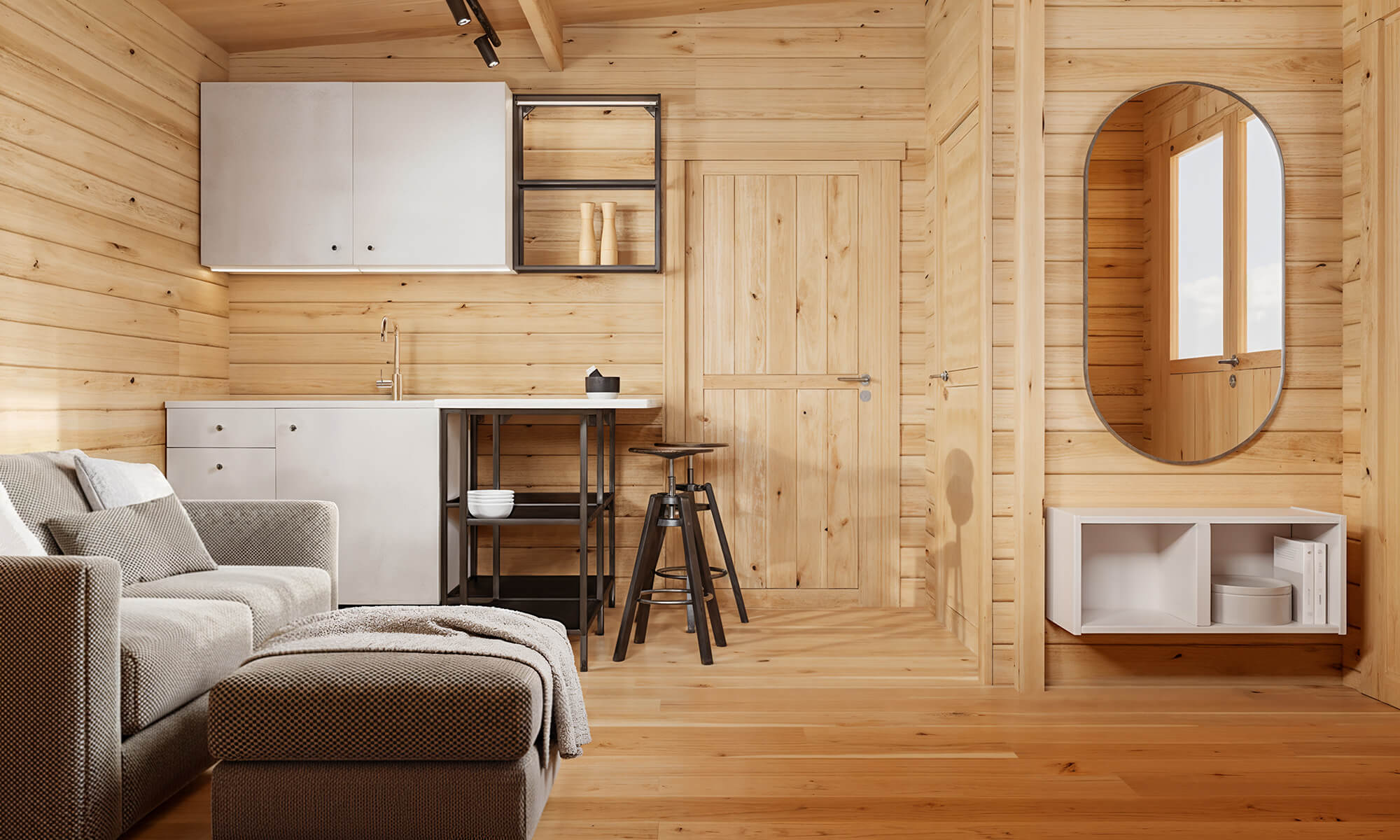 Na powierzchni dopuszczalnej do budowy na zgłoszenie znajdziesz wszystko, co najważniejsze: funkcjonalną łazienkę, praktyczną sypialnię, pokój dzienny z możliwością urządzenia aneksu kuchennego oraz obszerny, w większości zabudowany taras. Domek idealnie nadaje się także na mniejsze działki narożne.